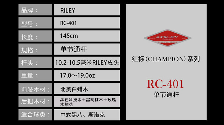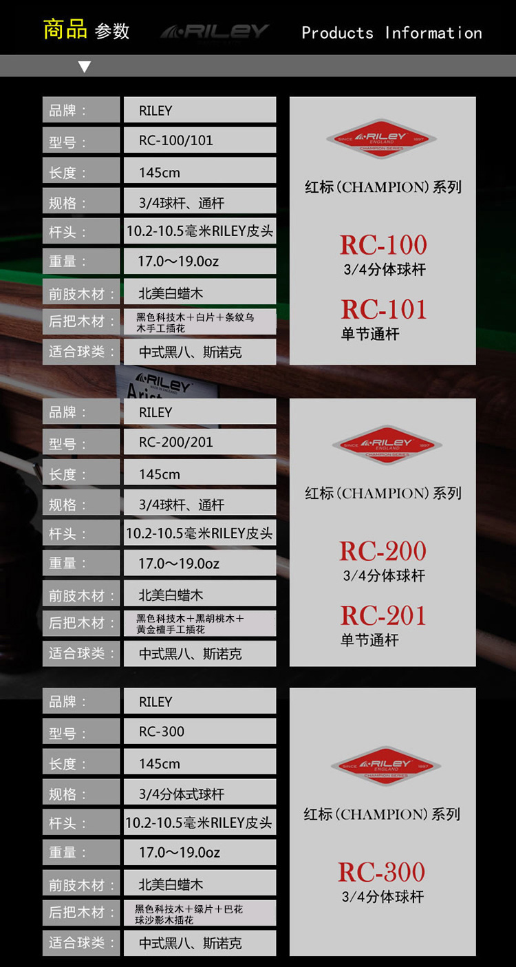 Riley 莱利 RC-100/101/200/201/300/401 冠军(红标)系列台球杆